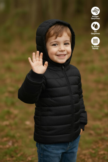 Erkek Çocuk Su ve Rüzgar Geçirmez İçi Kürklü Kapüşonlu Mont 20cm Siyah