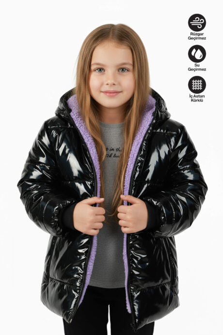 Kız Çocuk Su ve Rüzgar Geçirmez İçi Kürklü Kapüşonlu Mont Parlak Siyah