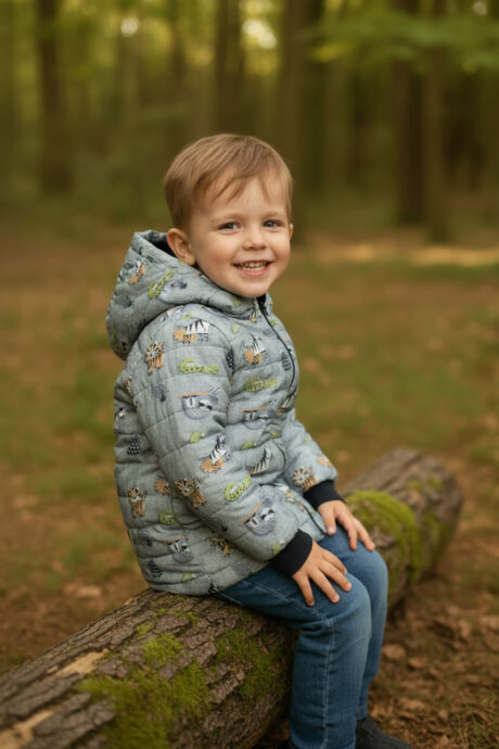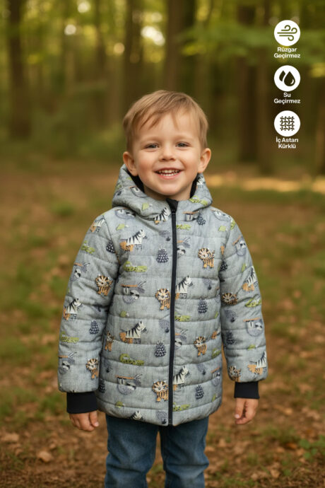 Erkek Çocuk Su ve Rüzgar Geçirmez İçi Kürklü Kapüşonlu Mont Hayvan Figürlü Gri