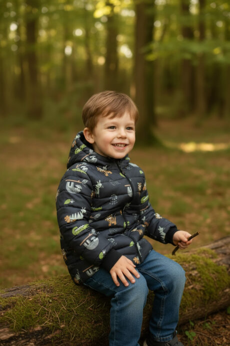 Erkek Çocuk Su ve Rüzgar Geçirmez İçi Kürklü Kapüşonlu Mont Hayvan Figürlü Siyah