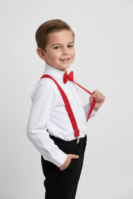 Erkek Çocuk Uzun Kol Beyaz Gömlek ve Kırmızı Askı Papyon Takım