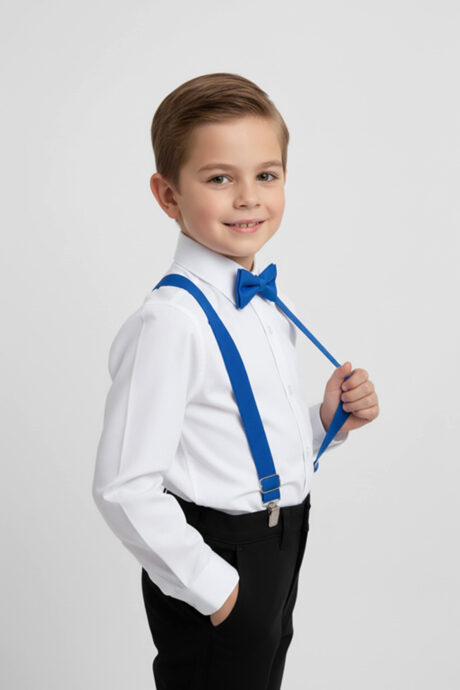 Erkek Çocuk Uzun Kol Beyaz Gömlek ve Mavi Askı Papyon Takım
