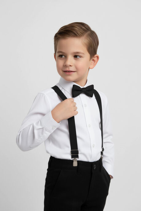 Erkek Çocuk Uzun Kol Beyaz Gömlek ve Siyah Askı Papyon Takım