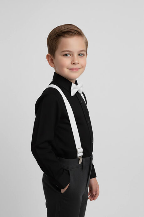 Erkek Çocuk Uzun Kol Siyah Gömlek ve Beyaz Askı Papyon Takım