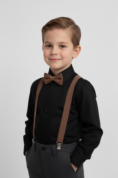 Erkek Çocuk Uzun Kol Siyah Gömlek ve Kahverengi Askı Papyon Takım