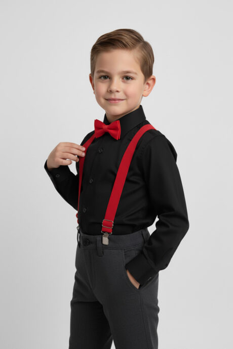 Erkek Çocuk Uzun Kol Siyah Gömlek ve Kırmızı Askı Papyon Takım