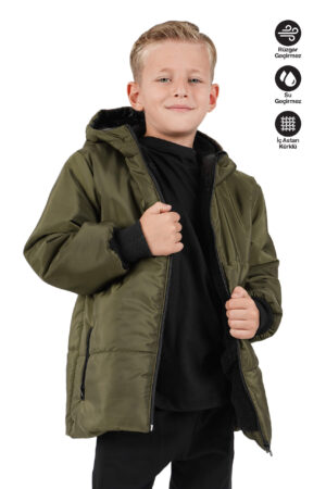 Erkek Çocuk Su ve Rüzgar Geçirmez İçi Kürklü Kapüşonlu Mont, hem sıcak tutan yapısı hem de dayanıklı dış yüzeyiyle konfor ve korumayı bir araya getiriyor.