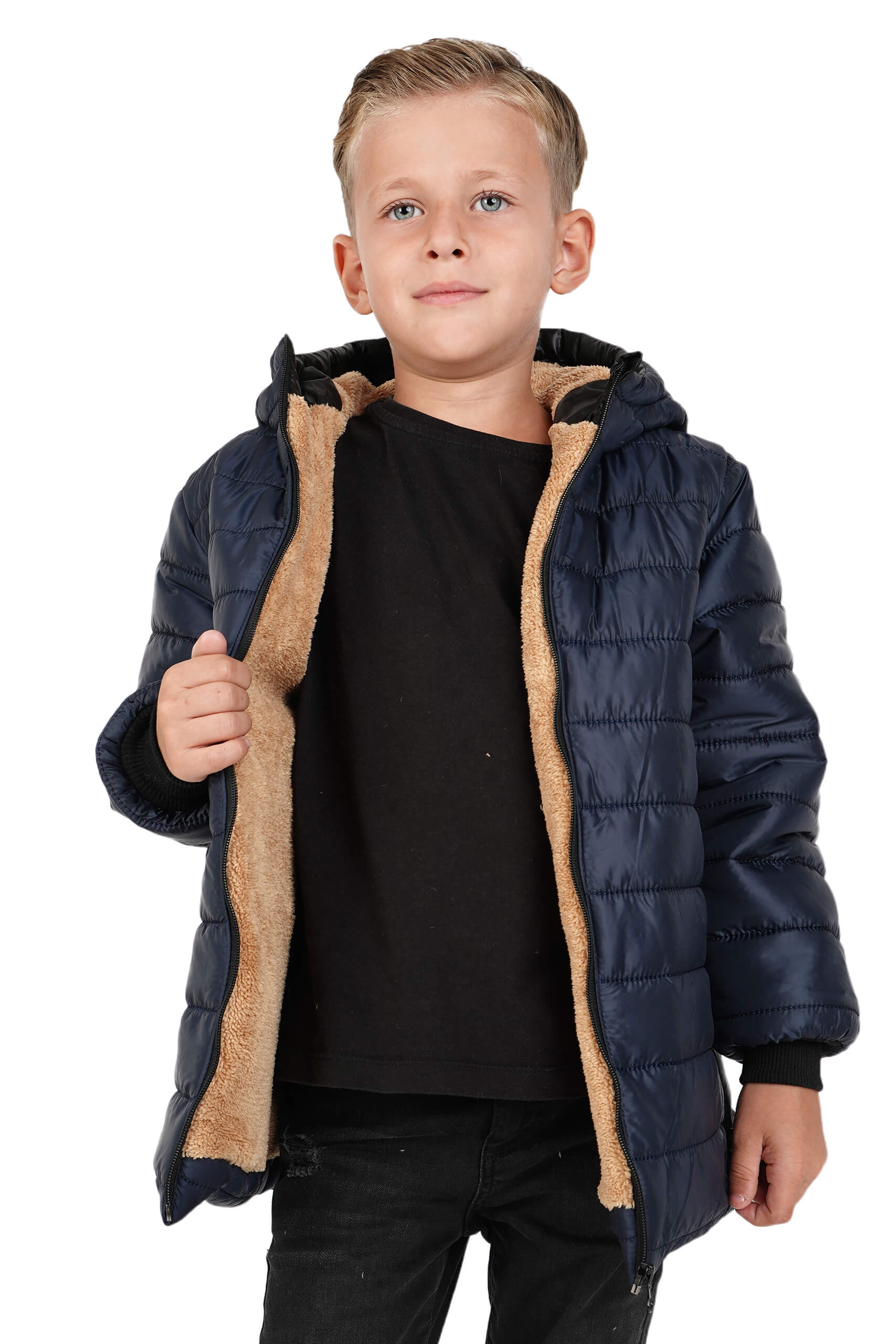Erkek Çocuk Su ve Rüzgar Geçirmez İçi Kürklü Kapüşonlu Mont, hem sıcak tutan yapısı hem de dayanıklı dış yüzeyiyle konfor ve korumayı bir araya getiriyor.