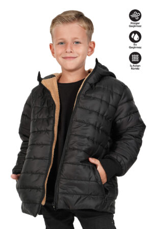 Erkek Çocuk Su ve Rüzgar Geçirmez İçi Kürklü Kapüşonlu Mont, hem sıcak tutan yapısı hem de dayanıklı dış yüzeyiyle konfor ve korumayı bir araya getiriyor.