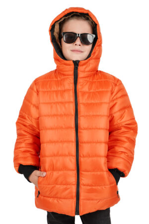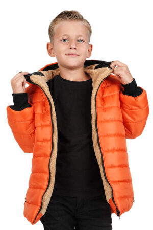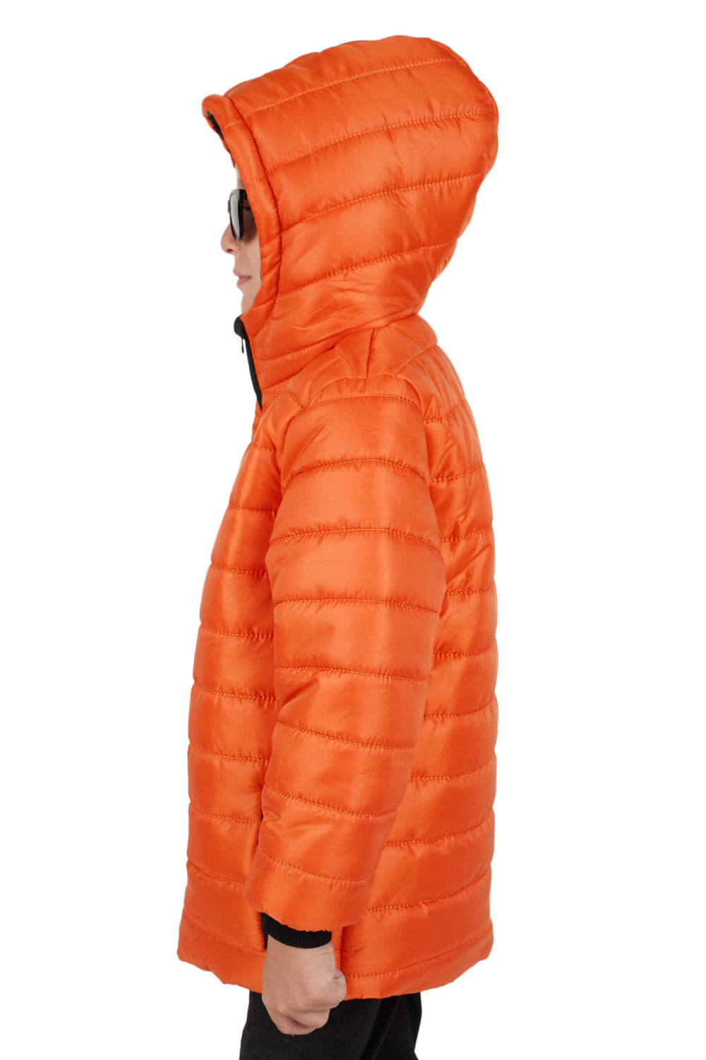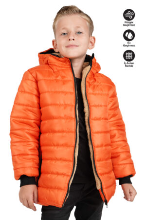 Erkek Çocuk Su ve Rüzgar Geçirmez İçi Kürklü Kapüşonlu Mont Yatay Çizgili Turuncu