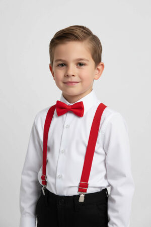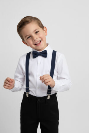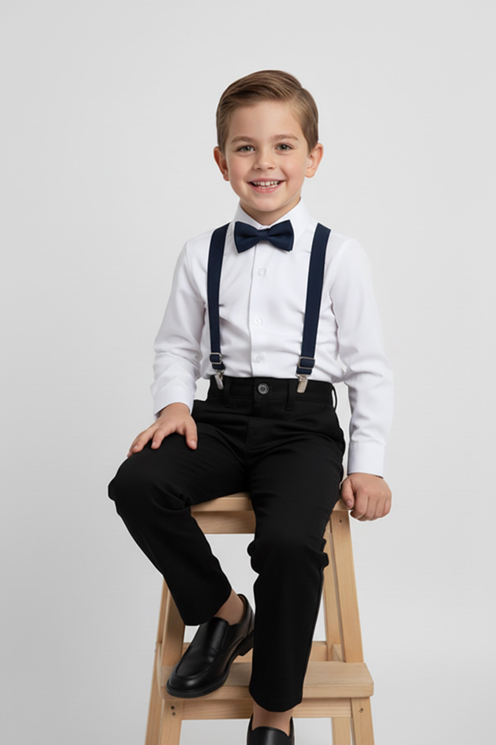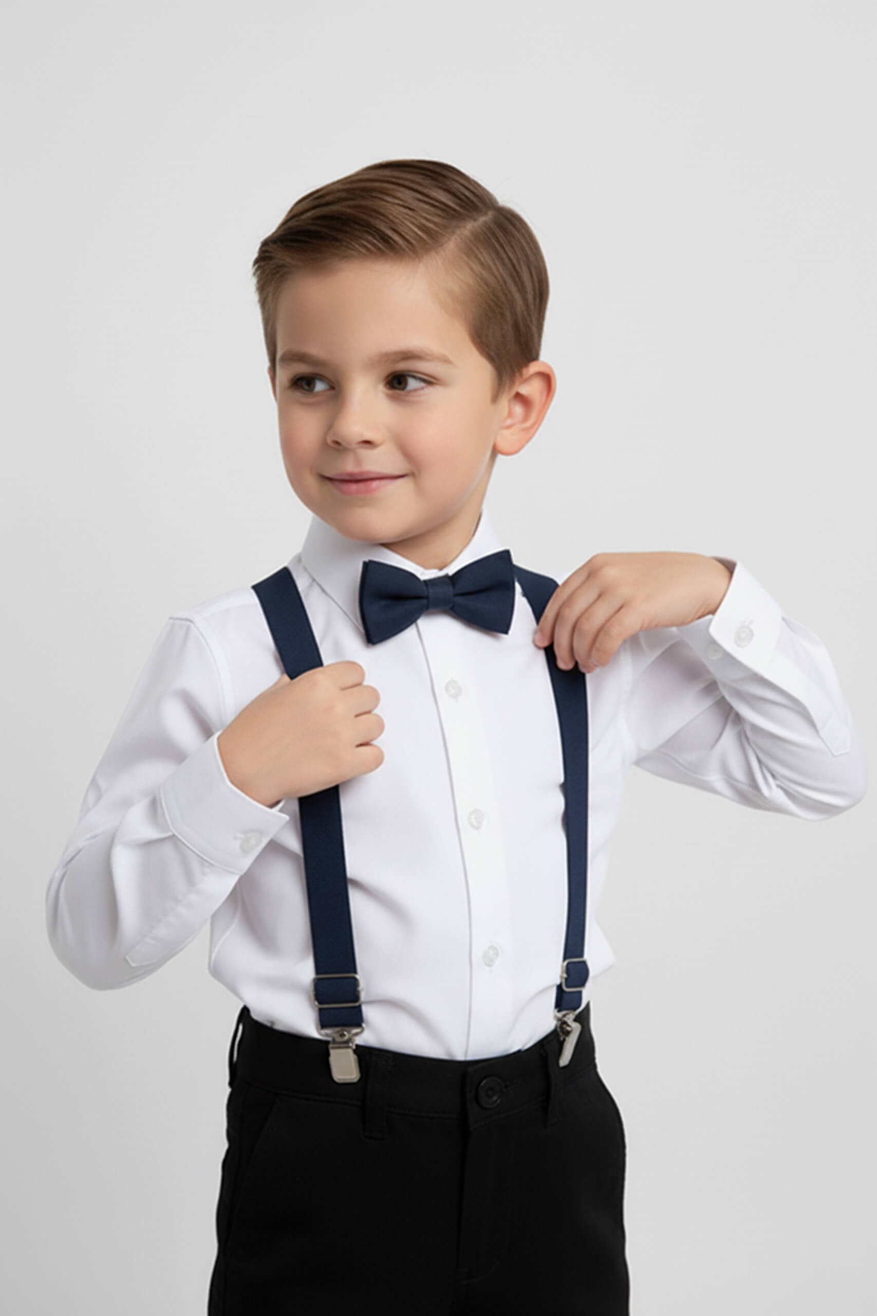 Minik beylerin şıklığını tamamlayan özel bir kombin! Beyaz gömlek ile lacivert askı ve papyonun uyum içinde bir araya geldiği bu 3’lü takım, düğün, doğum günü, bayram ve özel etkinlikler için ideal bir tercihtir.