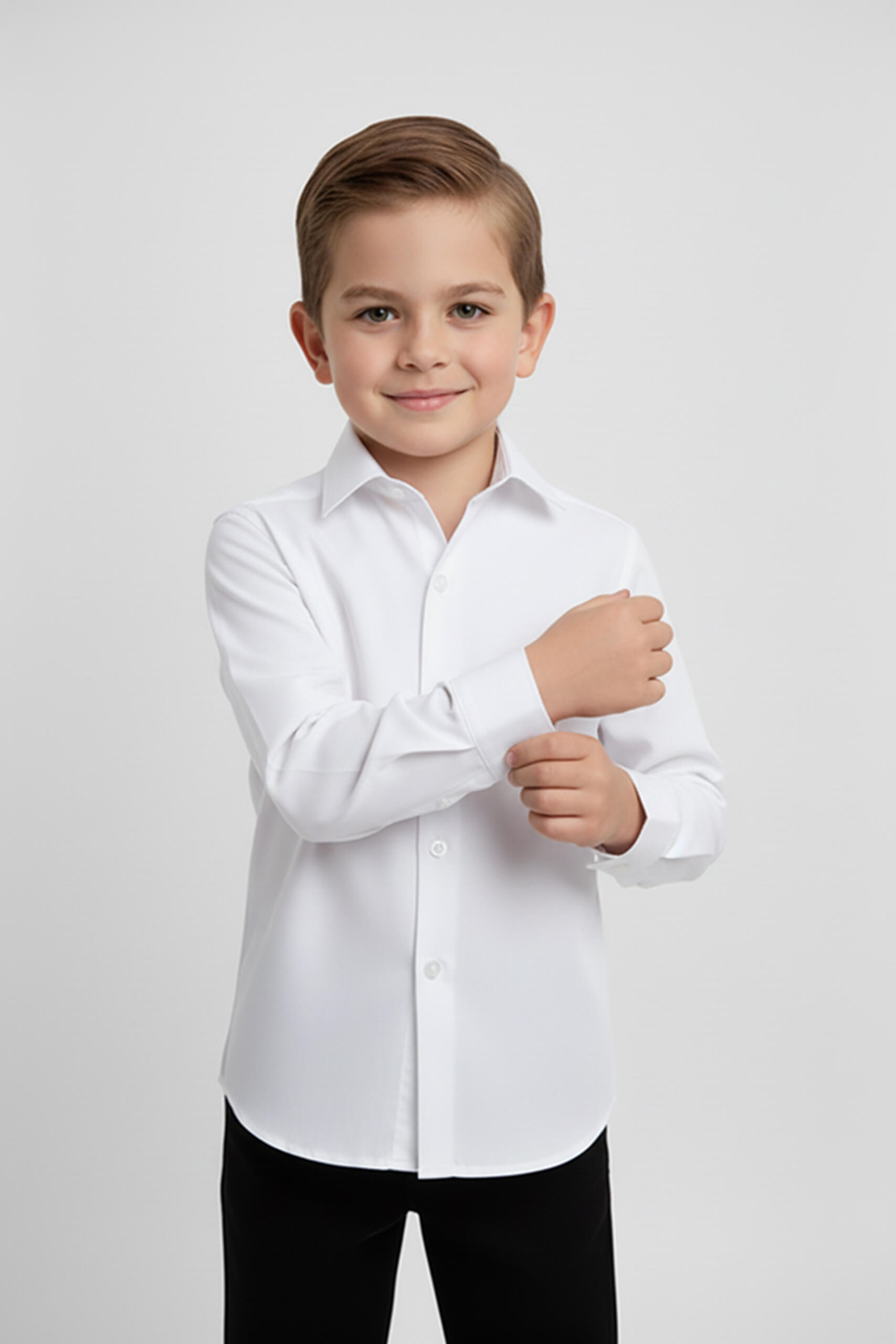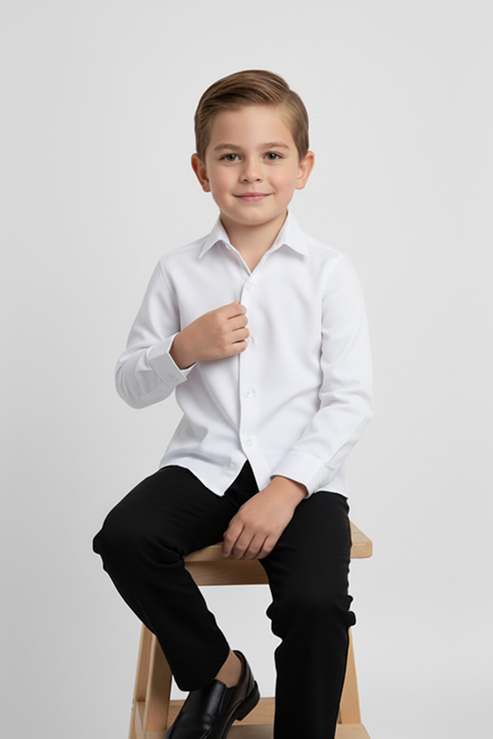 Modern kesimi ve rahat kalıbı sayesinde çocukların gün boyu konforlu hissetmesini sağlar. Şık görünümüyle dikkat çekerken, beyaz rengin verdiği zarafet sayesinde pantolon, yelek, ceket, askı papyon veya kravat gibi farklı parçalarla kolayca kombinlenebilir.