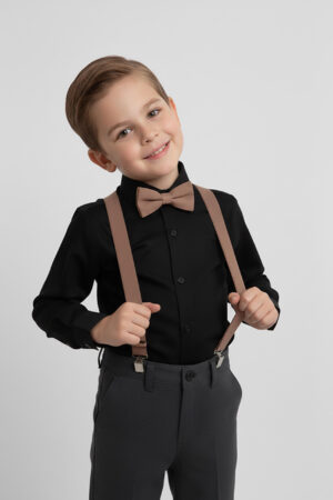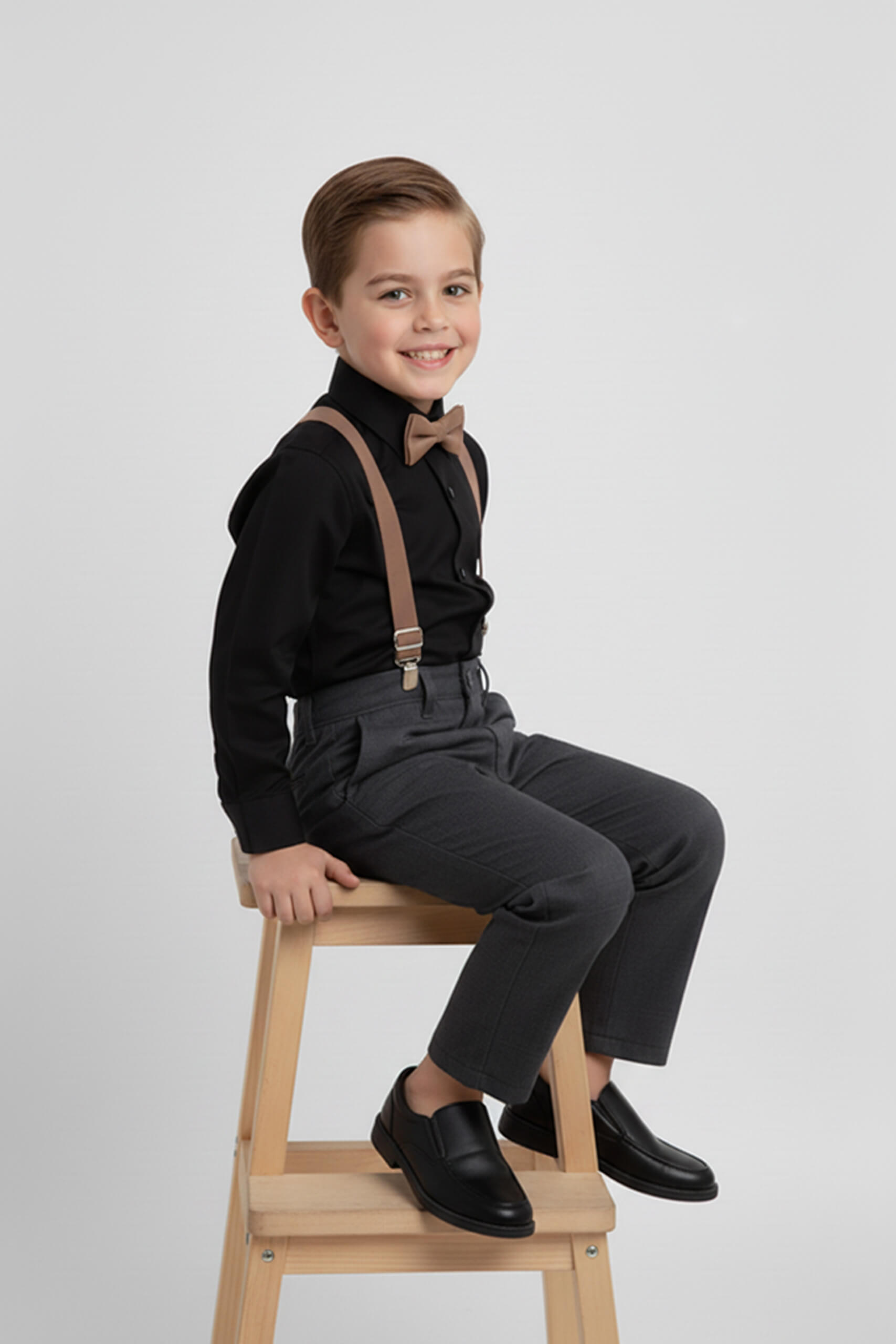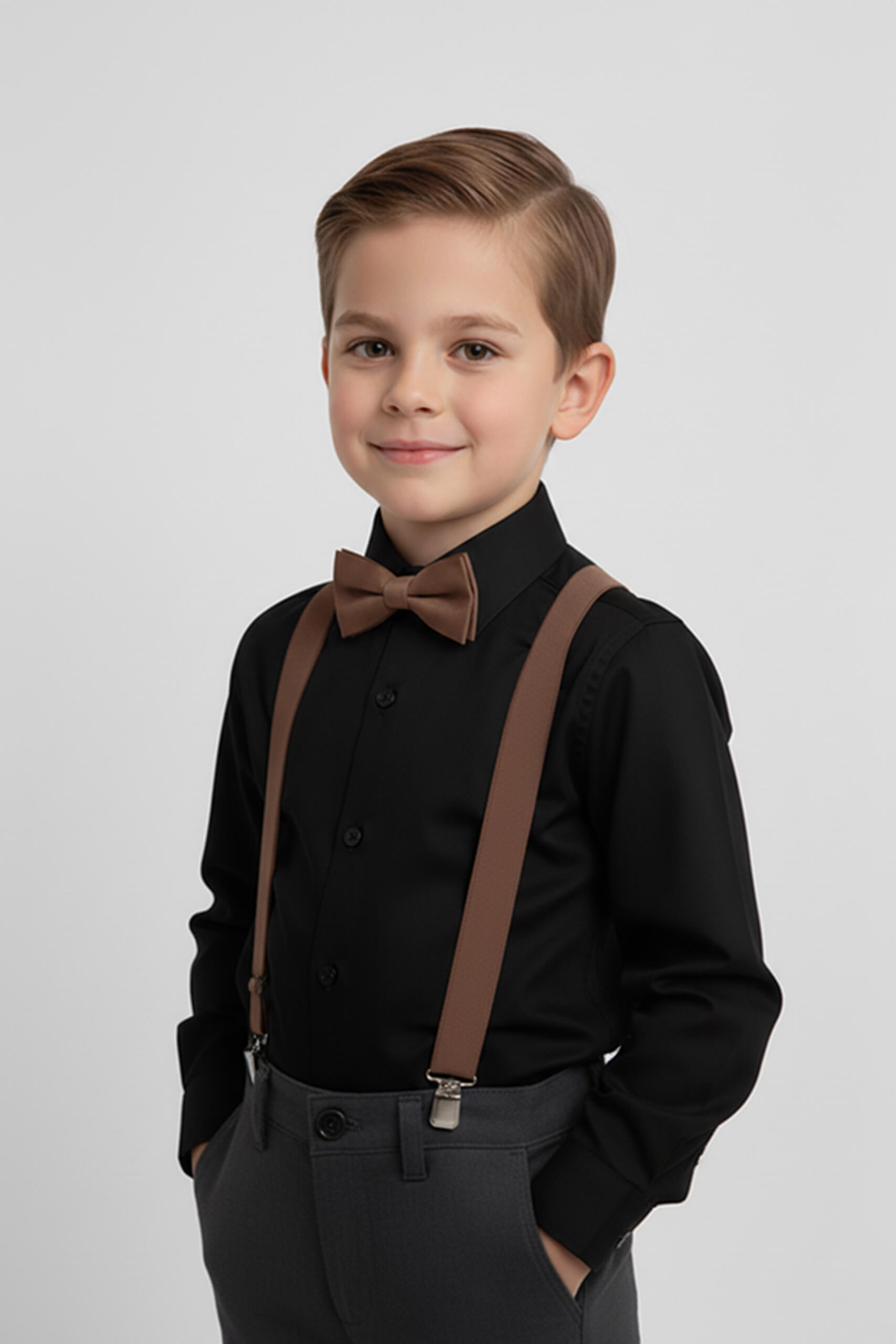 Erkek Çocuk Uzun Kol Siyah Gömlek ve Kahverengi Askı Papyon Takım