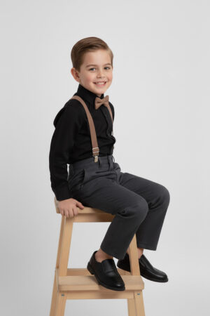 Minik beylerin şıklığını tamamlayan özel bir kombin! Siyah gömlek ile kahverengi askı ve papyonun uyum içinde bir araya geldiği bu 3’lü takım, düğün, doğum günü, bayram ve özel etkinlikler için ideal bir tercihtir.