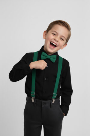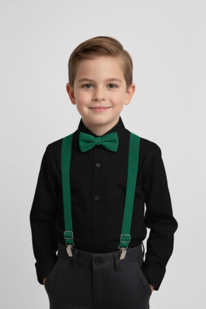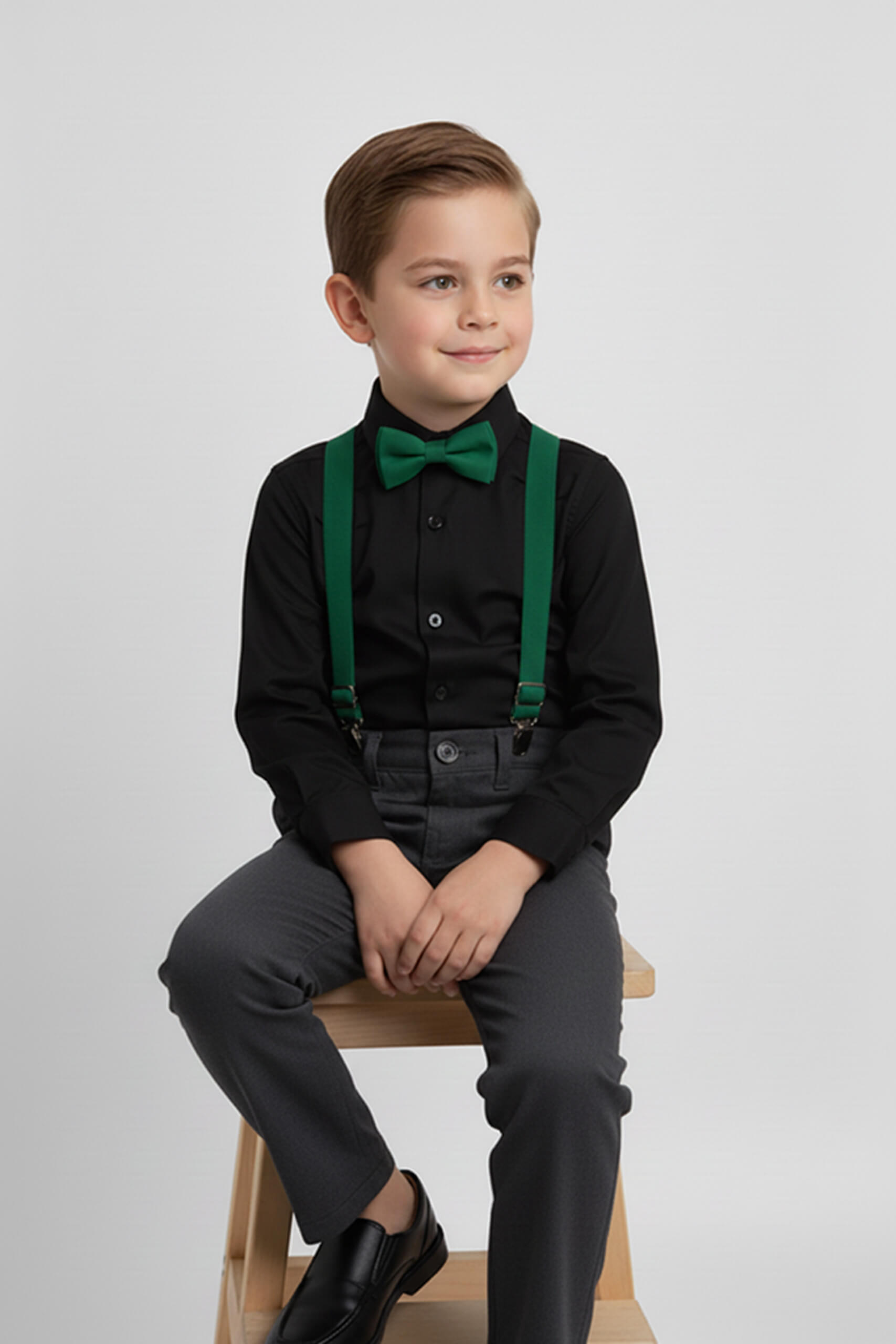 Minik beylerin şıklığını tamamlayan özel bir kombin! Siyah gömlek ile yeşil askı ve papyonun uyum içinde bir araya geldiği bu 3’lü takım, düğün, doğum günü, bayram ve özel etkinlikler için ideal bir tercihtir.