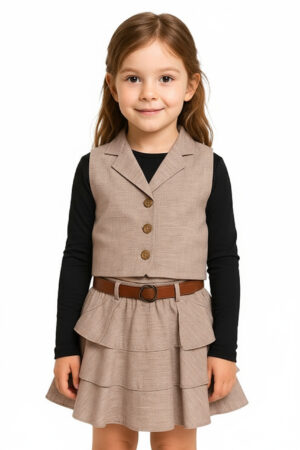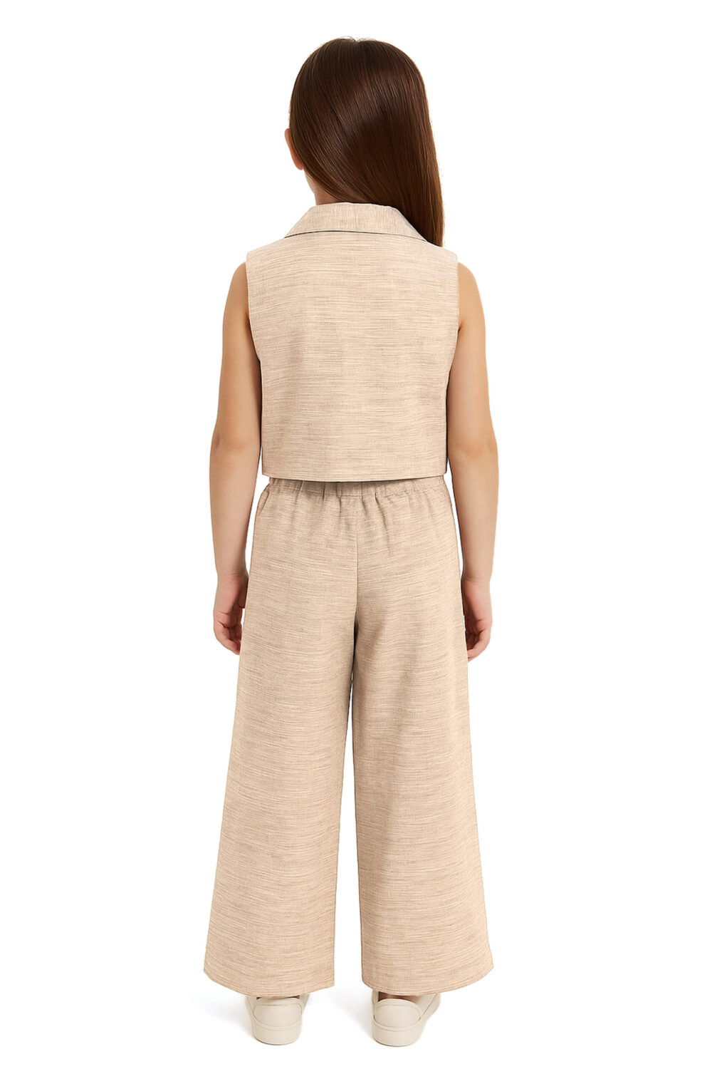 Kız Çocuk Keten Yelek ve Pantolonlu 2li Takım Krem