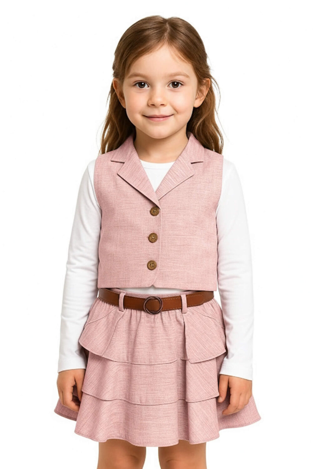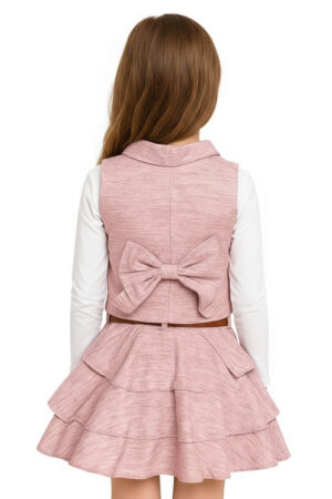 Kız Çocuk Keten Yelekli, Etekli ve Beyaz Badili 3lü Takım (Kemer Aksesuarlı) Pembe