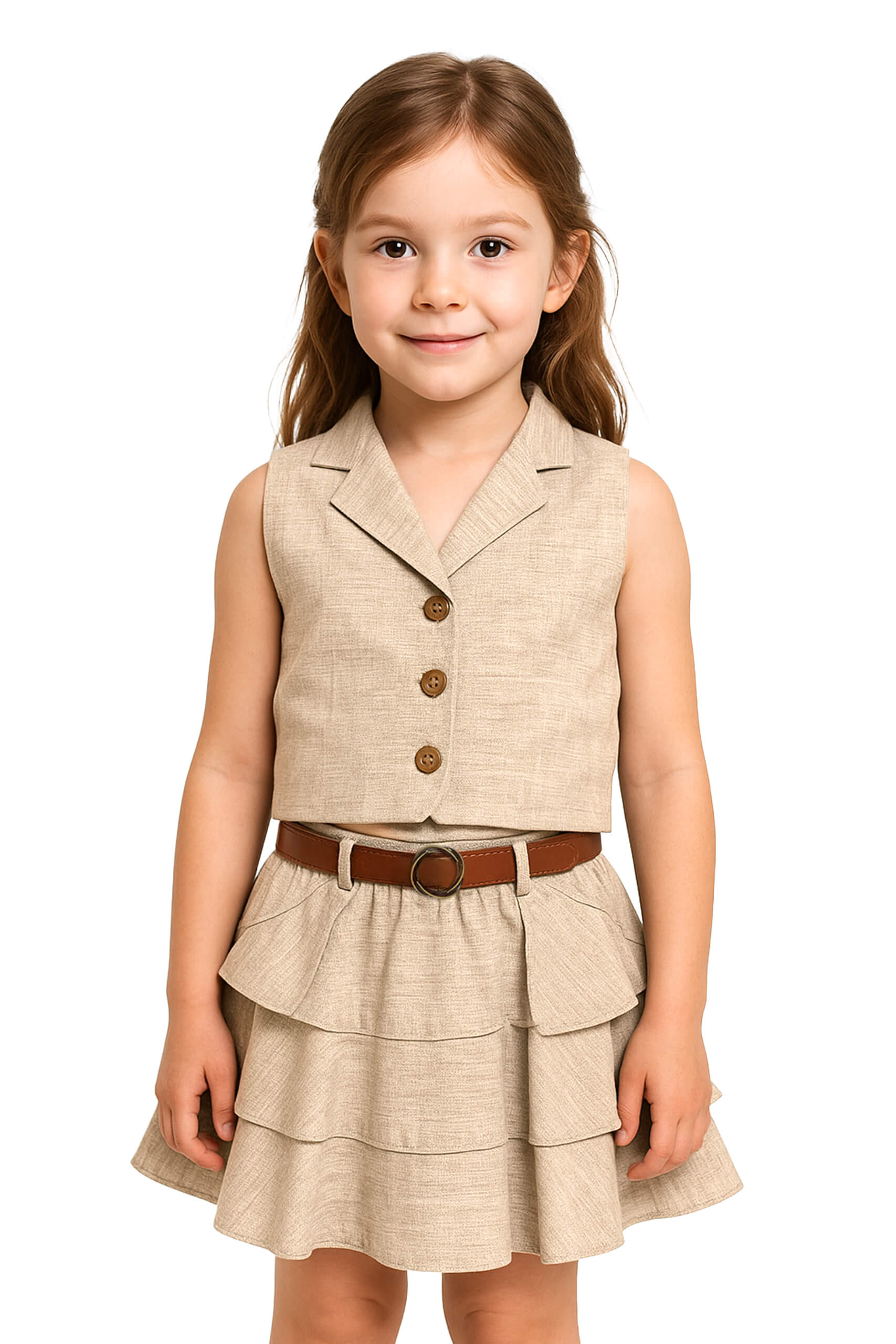 Kız Çocuk Keten Yelekli ve Etekli 2li Takım (Kemer Aksesuarlı) Krem