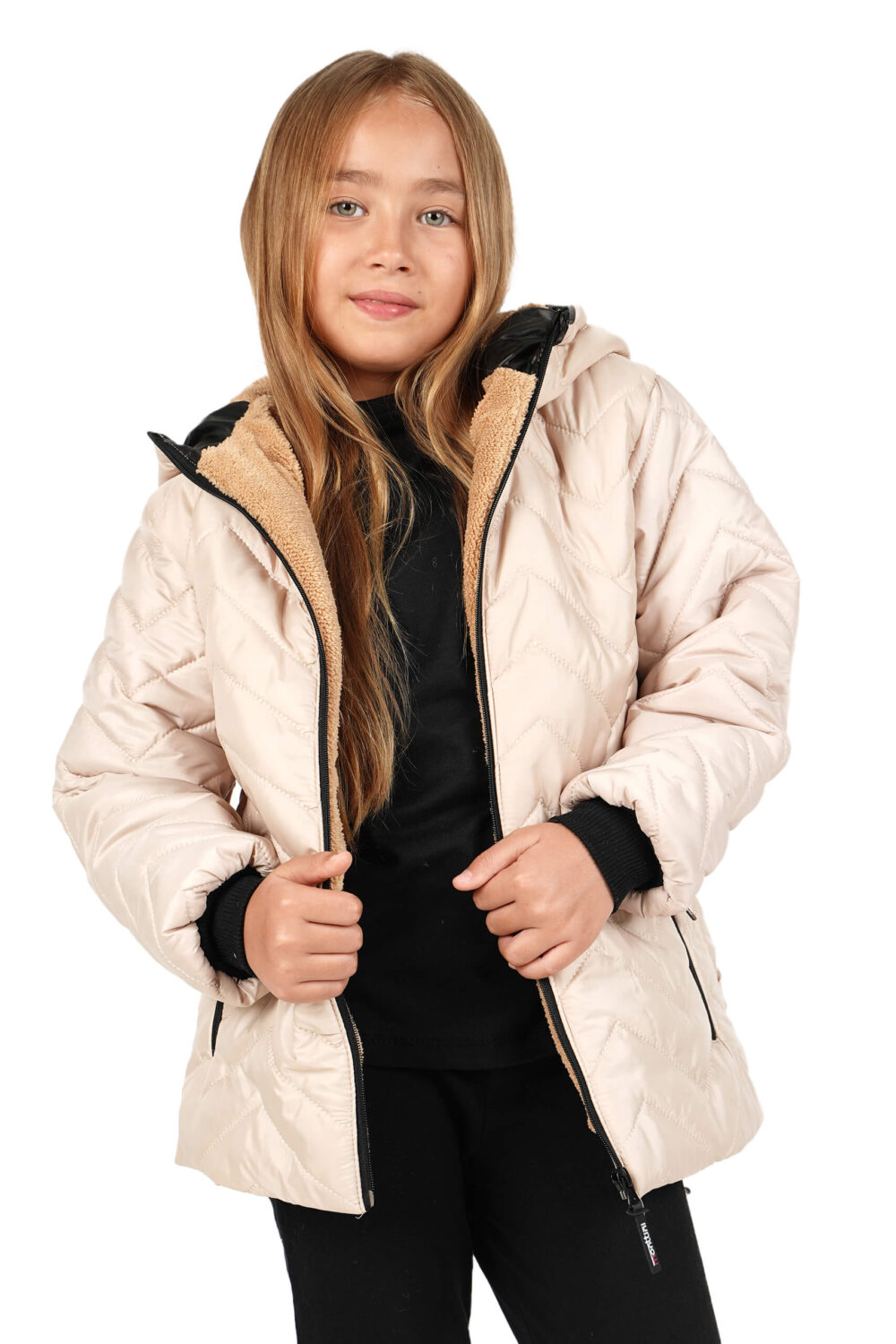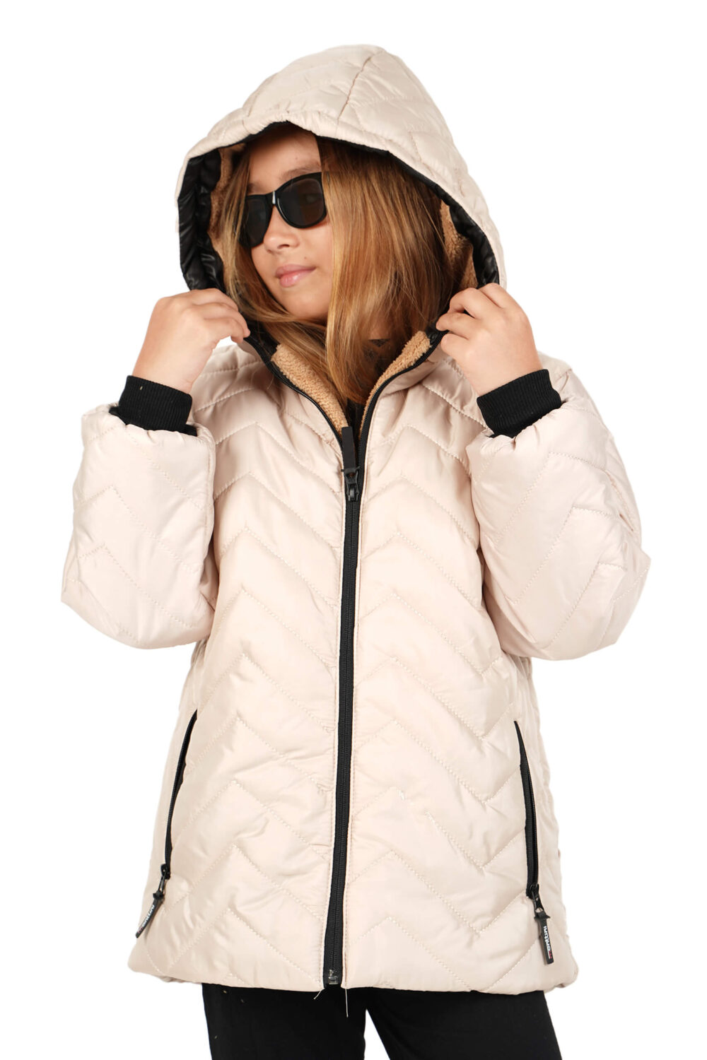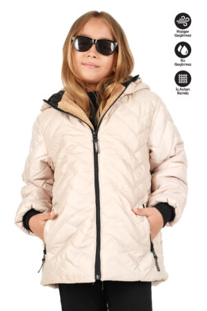 Kız Çocuk Su ve Rüzgar Geçirmez İçi Kürklü Kapüşonlu Mont Zigzag Desenli Ekru